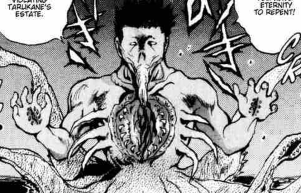 After learning the presence of intruders, Tarukane orders Hirue to act as a security guard, searching the building's vicinity and killing anyone trying to rescue Yukina. Meanwhile, Yusuke, Kuwabara, and Botan continue their approach towards Tarukane's mansion, slowly advancing through the surrounding forest. Suddenly, they are approached by Hirue, who, dressed in casual business attire, presumes the trio to be a group of lost hikers, and politely asks them to leave. However, after observing their knowledge of the crime lord Tarukane, he no longer mistakes them for a group of bystanders, quickly morphing into his demon form, equipped with green pigmentation and plant-like appendages.