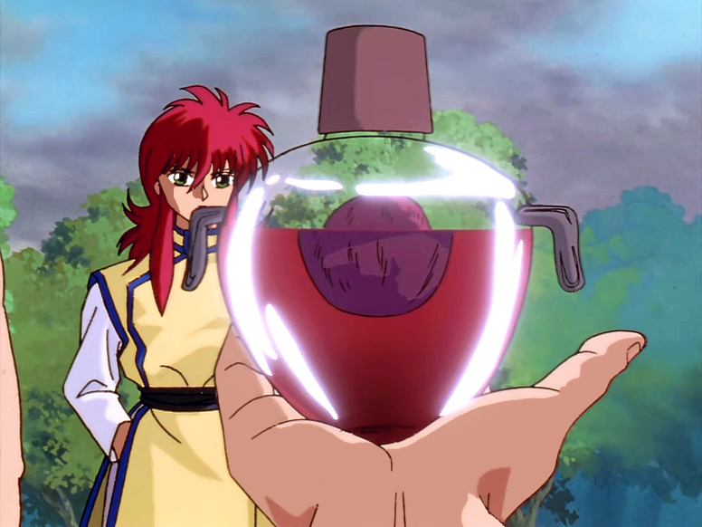 Fruit of the Previous Life potion (前世の実 ・ の ・ 薬, Zensenomi no Kusuri, translated as Previous World's Fruits / Medicine: A potion that that was made from the Fruit of the Previous Life, a fruit handpicked from the upper realms of the Spirit World is given to Kurama after Suzuki gets beaten by Genkai in the Dark Tournament. The fruit possesses the ability to revert a person to an earlier stage in their life, serving as the basis for the smoke for Ura Urashima's Idun Box. The potion helps Kurama turn into Yoko Kurama at will. The side effect of the potion is a resulting inbalance between his human side and demon side.